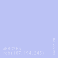 Цвет #BBC2F5 в цветовой модели RGB обозначается тремя октетами (187, 194, 245) в десятичном формате и #BBC2F5 в шестнадцатиричном (hex) формате, которые являются интенсивностью красного 187 (hex BB), интенсивность зелёного 194 (hex C2) и интенсивность синего 245 (hex F5).