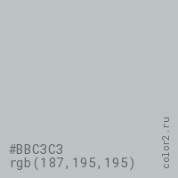 Цвет #BBC3C3 в цветовой модели RGB обозначается тремя октетами (187, 195, 195) в десятичном формате и #BBC3C3 в шестнадцатиричном (hex) формате, которые являются интенсивностью красного 187 (hex BB), интенсивность зелёного 195 (hex C3) и интенсивность синего 195 (hex C3).