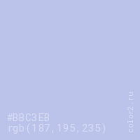 Цвет #BBC3EB в цветовой модели RGB обозначается тремя октетами (187, 195, 235) в десятичном формате и #BBC3EB в шестнадцатиричном (hex) формате, которые являются интенсивностью красного 187 (hex BB), интенсивность зелёного 195 (hex C3) и интенсивность синего 235 (hex EB).