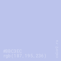 Цвет #BBC3EC в цветовой модели RGB обозначается тремя октетами (187, 195, 236) в десятичном формате и #BBC3EC в шестнадцатиричном (hex) формате, которые являются интенсивностью красного 187 (hex BB), интенсивность зелёного 195 (hex C3) и интенсивность синего 236 (hex EC).