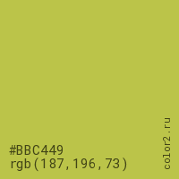 Цвет #BBC449 в цветовой модели RGB обозначается тремя октетами (187, 196, 73) в десятичном формате и #BBC449 в шестнадцатиричном (hex) формате, которые являются интенсивностью красного 187 (hex BB), интенсивность зелёного 196 (hex C4) и интенсивность синего 73 (hex 49).