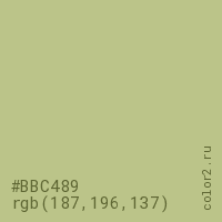 Цвет #BBC489 в цветовой модели RGB обозначается тремя октетами (187, 196, 137) в десятичном формате и #BBC489 в шестнадцатиричном (hex) формате, которые являются интенсивностью красного 187 (hex BB), интенсивность зелёного 196 (hex C4) и интенсивность синего 137 (hex 89).