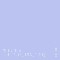 Цвет #BBC4F0 в цветовой модели RGB обозначается тремя октетами (187, 196, 240) в десятичном формате и #BBC4F0 в шестнадцатиричном (hex) формате, которые являются интенсивностью красного 187 (hex BB), интенсивность зелёного 196 (hex C4) и интенсивность синего 240 (hex F0).