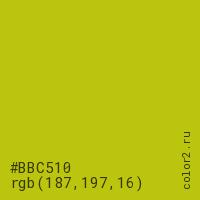 Цвет #BBC510 в цветовой модели RGB обозначается тремя октетами (187, 197, 16) в десятичном формате и #BBC510 в шестнадцатиричном (hex) формате, которые являются интенсивностью красного 187 (hex BB), интенсивность зелёного 197 (hex C5) и интенсивность синего 16 (hex 10).