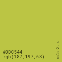 Цвет #BBC544 в цветовой модели RGB обозначается тремя октетами (187, 197, 68) в десятичном формате и #BBC544 в шестнадцатиричном (hex) формате, которые являются интенсивностью красного 187 (hex BB), интенсивность зелёного 197 (hex C5) и интенсивность синего 68 (hex 44).
