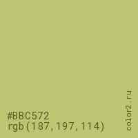 Цвет #BBC572 в цветовой модели RGB обозначается тремя октетами (187, 197, 114) в десятичном формате и #BBC572 в шестнадцатиричном (hex) формате, которые являются интенсивностью красного 187 (hex BB), интенсивность зелёного 197 (hex C5) и интенсивность синего 114 (hex 72).
