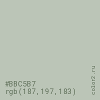 Цвет #BBC5B7 в цветовой модели RGB обозначается тремя октетами (187, 197, 183) в десятичном формате и #BBC5B7 в шестнадцатиричном (hex) формате, которые являются интенсивностью красного 187 (hex BB), интенсивность зелёного 197 (hex C5) и интенсивность синего 183 (hex B7).