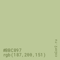 Цвет #BBC897 в цветовой модели RGB обозначается тремя октетами (187, 200, 151) в десятичном формате и #BBC897 в шестнадцатиричном (hex) формате, которые являются интенсивностью красного 187 (hex BB), интенсивность зелёного 200 (hex C8) и интенсивность синего 151 (hex 97).