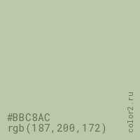 Цвет #BBC8AC в цветовой модели RGB обозначается тремя октетами (187, 200, 172) в десятичном формате и #BBC8AC в шестнадцатиричном (hex) формате, которые являются интенсивностью красного 187 (hex BB), интенсивность зелёного 200 (hex C8) и интенсивность синего 172 (hex AC).