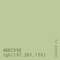 Цвет #BBC99B в цветовой модели RGB обозначается тремя октетами (187, 201, 155) в десятичном формате и #BBC99B в шестнадцатиричном (hex) формате, которые являются интенсивностью красного 187 (hex BB), интенсивность зелёного 201 (hex C9) и интенсивность синего 155 (hex 9B).