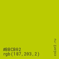 Цвет #BBCB02 в цветовой модели RGB обозначается тремя октетами (187, 203, 2) в десятичном формате и #BBCB02 в шестнадцатиричном (hex) формате, которые являются интенсивностью красного 187 (hex BB), интенсивность зелёного 203 (hex CB) и интенсивность синего 2 (hex 02).