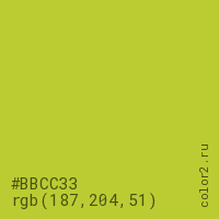 Цвет #BBCC33 в цветовой модели RGB обозначается тремя октетами (187, 204, 51) в десятичном формате и #BBCC33 в шестнадцатиричном (hex) формате, которые являются интенсивностью красного 187 (hex BB), интенсивность зелёного 204 (hex CC) и интенсивность синего 51 (hex 33).