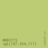 Цвет #BBCC75 в цветовой модели RGB обозначается тремя октетами (187, 204, 117) в десятичном формате и #BBCC75 в шестнадцатиричном (hex) формате, которые являются интенсивностью красного 187 (hex BB), интенсивность зелёного 204 (hex CC) и интенсивность синего 117 (hex 75).