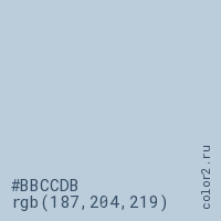 Цвет #BBCCDB в цветовой модели RGB обозначается тремя октетами (187, 204, 219) в десятичном формате и #BBCCDB в шестнадцатиричном (hex) формате, которые являются интенсивностью красного 187 (hex BB), интенсивность зелёного 204 (hex CC) и интенсивность синего 219 (hex DB).