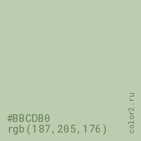Цвет #BBCDB0 в цветовой модели RGB обозначается тремя октетами (187, 205, 176) в десятичном формате и #BBCDB0 в шестнадцатиричном (hex) формате, которые являются интенсивностью красного 187 (hex BB), интенсивность зелёного 205 (hex CD) и интенсивность синего 176 (hex B0).