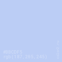 Цвет #BBCDF5 в цветовой модели RGB обозначается тремя октетами (187, 205, 245) в десятичном формате и #BBCDF5 в шестнадцатиричном (hex) формате, которые являются интенсивностью красного 187 (hex BB), интенсивность зелёного 205 (hex CD) и интенсивность синего 245 (hex F5).