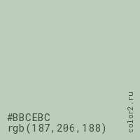 Цвет #BBCEBC в цветовой модели RGB обозначается тремя октетами (187, 206, 188) в десятичном формате и #BBCEBC в шестнадцатиричном (hex) формате, которые являются интенсивностью красного 187 (hex BB), интенсивность зелёного 206 (hex CE) и интенсивность синего 188 (hex BC).