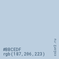 Цвет #BBCEDF в цветовой модели RGB обозначается тремя октетами (187, 206, 223) в десятичном формате и #BBCEDF в шестнадцатиричном (hex) формате, которые являются интенсивностью красного 187 (hex BB), интенсивность зелёного 206 (hex CE) и интенсивность синего 223 (hex DF).