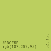 Цвет #BBCF5F в цветовой модели RGB обозначается тремя октетами (187, 207, 95) в десятичном формате и #BBCF5F в шестнадцатиричном (hex) формате, которые являются интенсивностью красного 187 (hex BB), интенсивность зелёного 207 (hex CF) и интенсивность синего 95 (hex 5F).