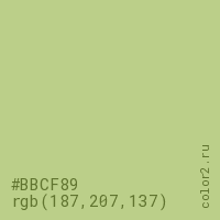 Цвет #BBCF89 в цветовой модели RGB обозначается тремя октетами (187, 207, 137) в десятичном формате и #BBCF89 в шестнадцатиричном (hex) формате, которые являются интенсивностью красного 187 (hex BB), интенсивность зелёного 207 (hex CF) и интенсивность синего 137 (hex 89).