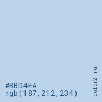 Цвет #BBD4EA в цветовой модели RGB обозначается тремя октетами (187, 212, 234) в десятичном формате и #BBD4EA в шестнадцатиричном (hex) формате, которые являются интенсивностью красного 187 (hex BB), интенсивность зелёного 212 (hex D4) и интенсивность синего 234 (hex EA).