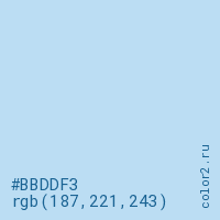 Цвет #BBDDF3 в цветовой модели RGB обозначается тремя октетами (187, 221, 243) в десятичном формате и #BBDDF3 в шестнадцатиричном (hex) формате, которые являются интенсивностью красного 187 (hex BB), интенсивность зелёного 221 (hex DD) и интенсивность синего 243 (hex F3).