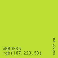 Цвет #BBDF35 в цветовой модели RGB обозначается тремя октетами (187, 223, 53) в десятичном формате и #BBDF35 в шестнадцатиричном (hex) формате, которые являются интенсивностью красного 187 (hex BB), интенсивность зелёного 223 (hex DF) и интенсивность синего 53 (hex 35).