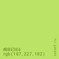 Цвет #BBE366 в цветовой модели RGB обозначается тремя октетами (187, 227, 102) в десятичном формате и #BBE366 в шестнадцатиричном (hex) формате, которые являются интенсивностью красного 187 (hex BB), интенсивность зелёного 227 (hex E3) и интенсивность синего 102 (hex 66).