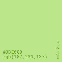 Цвет #BBE689 в цветовой модели RGB обозначается тремя октетами (187, 230, 137) в десятичном формате и #BBE689 в шестнадцатиричном (hex) формате, которые являются интенсивностью красного 187 (hex BB), интенсивность зелёного 230 (hex E6) и интенсивность синего 137 (hex 89).