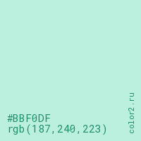 Цвет #BBF0DF в цветовой модели RGB обозначается тремя октетами (187, 240, 223) в десятичном формате и #BBF0DF в шестнадцатиричном (hex) формате, которые являются интенсивностью красного 187 (hex BB), интенсивность зелёного 240 (hex F0) и интенсивность синего 223 (hex DF).