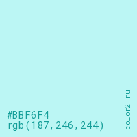 Цвет #BBF6F4 в цветовой модели RGB обозначается тремя октетами (187, 246, 244) в десятичном формате и #BBF6F4 в шестнадцатиричном (hex) формате, которые являются интенсивностью красного 187 (hex BB), интенсивность зелёного 246 (hex F6) и интенсивность синего 244 (hex F4).