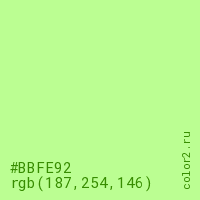 Цвет #BBFE92 в цветовой модели RGB обозначается тремя октетами (187, 254, 146) в десятичном формате и #BBFE92 в шестнадцатиричном (hex) формате, которые являются интенсивностью красного 187 (hex BB), интенсивность зелёного 254 (hex FE) и интенсивность синего 146 (hex 92).