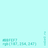 Цвет #BBFEF7 в цветовой модели RGB обозначается тремя октетами (187, 254, 247) в десятичном формате и #BBFEF7 в шестнадцатиричном (hex) формате, которые являются интенсивностью красного 187 (hex BB), интенсивность зелёного 254 (hex FE) и интенсивность синего 247 (hex F7).
