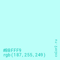 Цвет #BBFFF9 в цветовой модели RGB обозначается тремя октетами (187, 255, 249) в десятичном формате и #BBFFF9 в шестнадцатиричном (hex) формате, которые являются интенсивностью красного 187 (hex BB), интенсивность зелёного 255 (hex FF) и интенсивность синего 249 (hex F9).