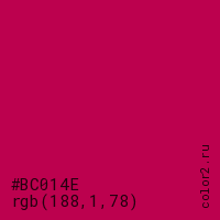 Цвет #BC014E в цветовой модели RGB обозначается тремя октетами (188, 1, 78) в десятичном формате и #BC014E в шестнадцатиричном (hex) формате, которые являются интенсивностью красного 188 (hex BC), интенсивность зелёного 1 (hex 01) и интенсивность синего 78 (hex 4E).