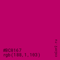 Цвет #BC0167 в цветовой модели RGB обозначается тремя октетами (188, 1, 103) в десятичном формате и #BC0167 в шестнадцатиричном (hex) формате, которые являются интенсивностью красного 188 (hex BC), интенсивность зелёного 1 (hex 01) и интенсивность синего 103 (hex 67).