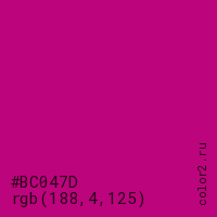 Цвет #BC047D в цветовой модели RGB обозначается тремя октетами (188, 4, 125) в десятичном формате и #BC047D в шестнадцатиричном (hex) формате, которые являются интенсивностью красного 188 (hex BC), интенсивность зелёного 4 (hex 04) и интенсивность синего 125 (hex 7D).