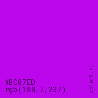 Цвет #BC07ED в цветовой модели RGB обозначается тремя октетами (188, 7, 237) в десятичном формате и #BC07ED в шестнадцатиричном (hex) формате, которые являются интенсивностью красного 188 (hex BC), интенсивность зелёного 7 (hex 07) и интенсивность синего 237 (hex ED).