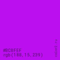 Цвет #BC0FEF в цветовой модели RGB обозначается тремя октетами (188, 15, 239) в десятичном формате и #BC0FEF в шестнадцатиричном (hex) формате, которые являются интенсивностью красного 188 (hex BC), интенсивность зелёного 15 (hex 0F) и интенсивность синего 239 (hex EF).