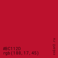 Цвет #BC112D в цветовой модели RGB обозначается тремя октетами (188, 17, 45) в десятичном формате и #BC112D в шестнадцатиричном (hex) формате, которые являются интенсивностью красного 188 (hex BC), интенсивность зелёного 17 (hex 11) и интенсивность синего 45 (hex 2D).