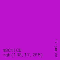 Цвет #BC11CD в цветовой модели RGB обозначается тремя октетами (188, 17, 205) в десятичном формате и #BC11CD в шестнадцатиричном (hex) формате, которые являются интенсивностью красного 188 (hex BC), интенсивность зелёного 17 (hex 11) и интенсивность синего 205 (hex CD).