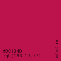 Цвет #BC134D в цветовой модели RGB обозначается тремя октетами (188, 19, 77) в десятичном формате и #BC134D в шестнадцатиричном (hex) формате, которые являются интенсивностью красного 188 (hex BC), интенсивность зелёного 19 (hex 13) и интенсивность синего 77 (hex 4D).