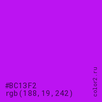 Цвет #BC13F2 в цветовой модели RGB обозначается тремя октетами (188, 19, 242) в десятичном формате и #BC13F2 в шестнадцатиричном (hex) формате, которые являются интенсивностью красного 188 (hex BC), интенсивность зелёного 19 (hex 13) и интенсивность синего 242 (hex F2).