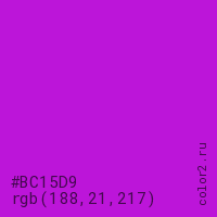 Цвет #BC15D9 в цветовой модели RGB обозначается тремя октетами (188, 21, 217) в десятичном формате и #BC15D9 в шестнадцатиричном (hex) формате, которые являются интенсивностью красного 188 (hex BC), интенсивность зелёного 21 (hex 15) и интенсивность синего 217 (hex D9).