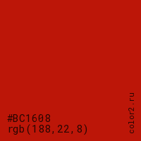 Цвет #BC1608 в цветовой модели RGB обозначается тремя октетами (188, 22, 8) в десятичном формате и #BC1608 в шестнадцатиричном (hex) формате, которые являются интенсивностью красного 188 (hex BC), интенсивность зелёного 22 (hex 16) и интенсивность синего 8 (hex 08).