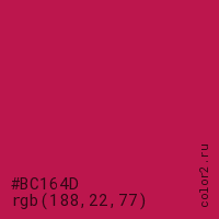Цвет #BC164D в цветовой модели RGB обозначается тремя октетами (188, 22, 77) в десятичном формате и #BC164D в шестнадцатиричном (hex) формате, которые являются интенсивностью красного 188 (hex BC), интенсивность зелёного 22 (hex 16) и интенсивность синего 77 (hex 4D).