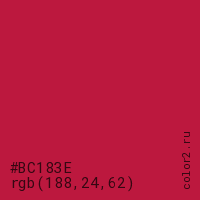 Цвет #BC183E в цветовой модели RGB обозначается тремя октетами (188, 24, 62) в десятичном формате и #BC183E в шестнадцатиричном (hex) формате, которые являются интенсивностью красного 188 (hex BC), интенсивность зелёного 24 (hex 18) и интенсивность синего 62 (hex 3E).