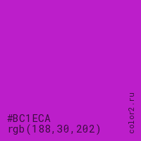 Цвет #BC1ECA в цветовой модели RGB обозначается тремя октетами (188, 30, 202) в десятичном формате и #BC1ECA в шестнадцатиричном (hex) формате, которые являются интенсивностью красного 188 (hex BC), интенсивность зелёного 30 (hex 1E) и интенсивность синего 202 (hex CA).