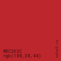 Цвет #BC262C в цветовой модели RGB обозначается тремя октетами (188, 38, 44) в десятичном формате и #BC262C в шестнадцатиричном (hex) формате, которые являются интенсивностью красного 188 (hex BC), интенсивность зелёного 38 (hex 26) и интенсивность синего 44 (hex 2C).