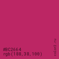 Цвет #BC2664 в цветовой модели RGB обозначается тремя октетами (188, 38, 100) в десятичном формате и #BC2664 в шестнадцатиричном (hex) формате, которые являются интенсивностью красного 188 (hex BC), интенсивность зелёного 38 (hex 26) и интенсивность синего 100 (hex 64).